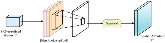 The attention mechanism is a widely used data processing method in machine learning that is used in various tasks, such as natural language processing, image recognition, and speech recognition. The attention mechanism mimics the observation mechanism of humans towards external entities. Generally, external information is attained by initially focusing on important local information and then integrating information from different regions when observing external entities. In other words, the attention mechanism allows machines to “pay attention” to the important parts as humans do, process, and understand data based on these important parts, thereby effectively performing various complex machine learning tasks. Spatial Attention [39] and SKNet [40] are two important attention mechanisms that will be introduced below.