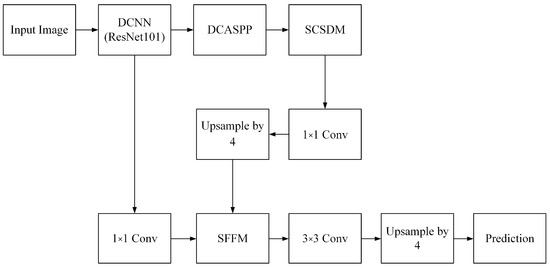 SDAMNet is an end-to-end neural network that adopts an encoder–decoder architecture. The encoder utilizes ResNet101 as the backbone, achieving multi-scale feature fusion through the DCASPP module and introducing global information aggregation. The SCSDM module further enhances the model’s ability to perceive important features and effectively captures target boundaries and details. The feature map is pre-processed by a 1 × 1 convolution to adjust the number of channels and an upsampling operation. The decoder achieves efficient feature fusion through the SFFM module, adaptively integrating the advantages of low-level and high-level features. The model’s semantic segmentation accuracy and effectiveness are substantially improved by comprehensively utilizing multi-scale features, introducing global information, and capturing detailed information.