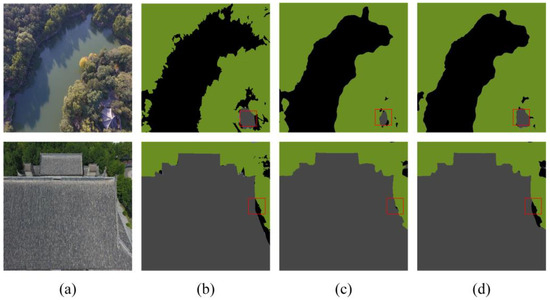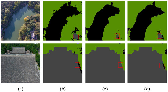 The Aerial Drone Image dataset [41] is an open-source aerial drone image dataset available on Kaggle, which includes 24 different categories. This dataset aims to improve the semantic understanding and safety of autonomous UAV flight and landing sequences in urban scenarios. The images in this dataset are captured from an aerial perspective, depicting areas ranging from 5 to 30 m above the ground and containing over 20 buildings. Each image is captured by a high-resolution camera with a resolution of 6000 × 4000 pixels. Focusing on urban scenes, only a small number of individual images from limited categories are retained, resulting in 400 images. For training and evaluating the machine learning models, the dataset is divided into training, validation, and testing sets with a ratio of 8:1:1. Figure 8 depicts some sample images, where the first and third rows are the original images, and the second and fourth rows are the corresponding label images.