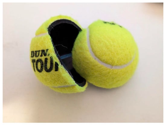 For the current project, there was a compromise regarding the tennis ball’s weight since the sensor pocket measured 35 mm per side, resulting in an added mass of 31.3 g, as shown in Figure 11. This figure also illustrated the tennis ball with the sensor pocket carved out, highlighting the modifications made to accommodate the sensor system.