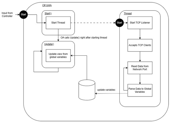 Next, we set up communication through a network port between Python and C# in Unity, facilitated by a TCP connection on the same machine. A listening server was implemented in C# Unity using the System.Net.Sockets library, where a TCP listener was initiated with TcpListener(IPAddress.Any, connectionPort). This setup allows acceptance from both IPv4 and IPv6 addresses and sets the network port number as specified in connectionPort, an integer provided via the Unity GUI. The server was activated with server.Start(), and upon receiving a connection request from Python, it accepted the client using server.AcceptTcpClient(). To ensure reliable connections, the server setup and client connection processes were executed within a separate thread, as depicted in Figure 17. This threading allowed Unity’s Update() function to run uninterrupted while the server waits for connection requests and data from Python.