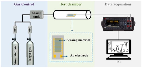 The sensor’s performance was evaluated using a dynamic gas flow device, as shown in Figure 1. All gases used in this study were supplied in certified cylinders by Dalian GuangMing Special Gas Products Co., Ltd. (Dalian, China). The composition of the simulated air was 70% N2 and 30% O2. All other gases were at a concentration of 100 ppm. The simulated air and target gases were mixed into different concentrations in a mixing tank under the precise control of a mass flow controller (MFC; Criterion D500, Horina, Kyoto, Japan) and introduced into the test chamber at a steady flow rate of 300 sccm. The sensors were placed in a test chamber for electrical measurement, with resistance values recorded by a source meter (34470A, Keysight, Santa Rosa, CA, USA) and a computer-aided measurement instrument.