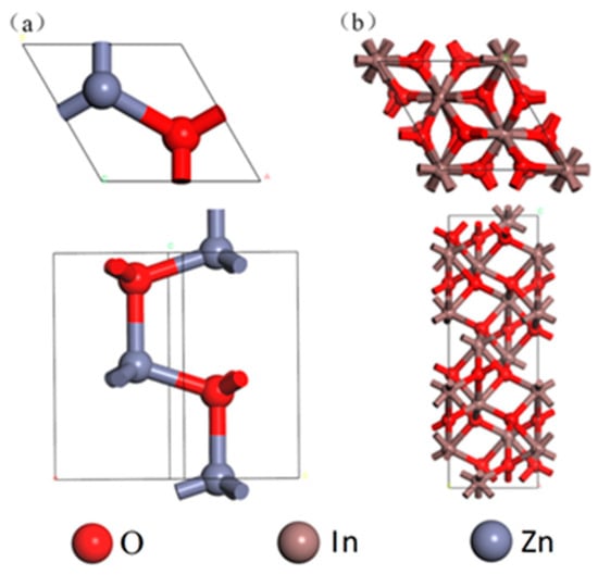 In this work, density functional theory (DFT) calculations were conducted using the Vienna Ab initio Simulation Package (VASP 5.2) [26,27,28]. Generalized gradient approximation (GGA) was applied for the exchange-correlation energy and interatomic interactions with Perdew–Burke–Ernzerh adsorption configurations. The cut-off energy was set at 400 eV. Monkhorst–Pack k-point meshes (2 × 6 × 1) were employed for structural relaxation within the Brillouin zone. The convergence criteria for energy and force were 1 × 10−4 eV and 3 × 10−2 eV/Å, respectively. In this work, the original computational model was adopted with a ZnO fibrillar zincite structure and an In2O3 rhombic-centered hexahedral structure, as shown in Figure 2.