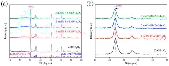Figure 3 illustrates the XRD spectra of 1–3 mol% Rb-ZnO/In2O3 and ZnO/In2O3 composites. The XRD patterns of all four samples exhibited characteristic peaks of In2O3 and ZnO, as shown in Figure 3a. Among them, those diffraction peaks with 2θ values of 30.49°, 50.88°, and 60.49° belong to the crystalline facets of (222), (440), and (622) of In2O3 (JCPDS No. 65-3170), respectively. Meanwhile, those diffraction peaks with 2θ values of 31.60°, 33.30°, and 36.08° belong to the crystalline facets of (100), (002), and (101) of ZnO (JCPDS No. 79-0208), respectively. No other characteristic peaks were detected, indicating the high purity of the obtained composites. It is noteworthy that the loaded Rb metal element, due to its low content, resulted in the absence of characteristic diffraction peaks. This situation has been reported in several literature works [20]. High-resolution XRD maps of the four samples are shown in Figure 3b, in which the characteristic diffraction peaks of In2O3 (222) shifted as the loading of Rb increased. This is due to the fact that the ionic radius of Rb+ is larger than that of In3+ and Zn2+ [29,30,31,32].