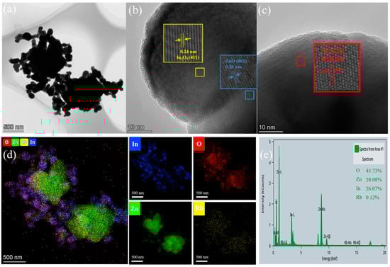 Figure 5a shows a TEM image of 2 mol% Rb-ZnO/In2O3. The central part is a ZnO block approximately 800 nm in size, surrounded by small In2O3 particles approximately 50 nm in size and dispersed Rb particles. It can be seen that the 2 mol% Rb-ZnO/In2O3 composite maintains excellent distribution and size homogeneity. Figure 5b presents a HR-TEM image of 2 mol% Rb-ZnO/In2O3. It clearly shows the contact interface between two different crystal structures with lattice spacings of 0.24 and 0.26 nm, corresponding to the In2O3 (411) and ZnO (002) faces, respectively. Meanwhile, the lattice spacing of 0.19 nm belongs to the (220) crystal surface of Rb, as shown in Figure 5c. It can be seen from the inset that the Rb atoms are ordered and uniform in size and have no other coordinating atoms. This means that the crystal consists of Rb atoms [33]. Figure 5d shows the EDS elemental mapping analysis of 2 mol% Rb-ZnO/In2O3. This analysis shows that Zn (green) is distributed in the middle to form a block, and In (blue), O (red), and Rb (yellow) are distributed around ZnO. Where no other elements were detected, the corresponding elemental content estimation is shown in Figure 5e. This confirms that the prepared Rb-loaded ZnO/In2O3 composites consisted of In, O, Zn, and Rb. All of the above characterization results confirm the successful loading of Rb into the ZnO/In2O3 heterojunction composites. The dimensions of the ZnO/In2O3 heterojunction, as well as the heterostructure of ZnO/In2O3, were not changed before or after loading.