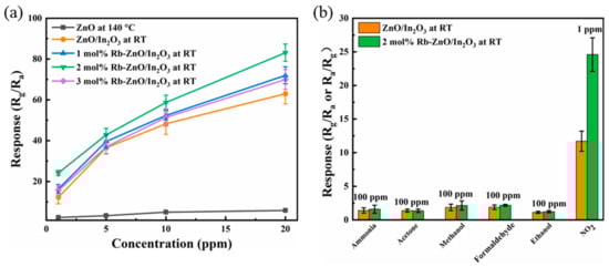 (a) Comparison of ZnO, ZnO/In2O3, and 1–3 mol% Rb-ZnO/In2O3 sensor response values to 1–20 ppm NO2; (b) selectivity test of ZnO/In2O3 and 2 mol% Rb-ZnO/In2O3 sensor.