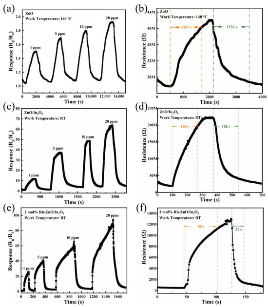 (a) Dynamic response–recovery curve versus different NO2 concentrations (1–20 ppm) of ZnO at 140 °C, (b) response–recovery time of the ZnO sensor to 1 ppm of NO2 at 140 °C, (c) dynamic response–recovery curve versus different NO2 concentrations (1–20 ppm) of ZnO/In2O3 at RT, (d) response–recovery time of the ZnO/In2O3 sensor to 1 ppm of NO2 at RT, (e) dynamic response–recovery curve versus different NO2 concentrations (1–20 ppm) of 2 mol% Rb-ZnO/In2O3 at RT, and (f) response–recovery time of the 2 mol% Rb-ZnO/In2O3 sensor to 1 ppm of NO2 at RT.