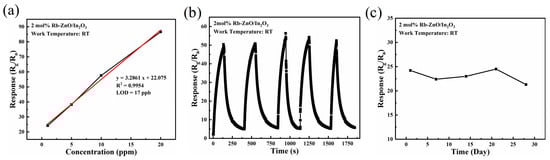 (a) Linear fit curve of the 2 mol% Rb-ZnO/In2O3 sensor to 1–20 ppm of NO2, (b) repeatability test of the 2 mol% Rb-ZnO/In2O3 sensor to 10 ppm of NO2, (c) long-term stability of the 2 mol% Rb-ZnO/In2O3 sensor to 1 ppm of NO2.