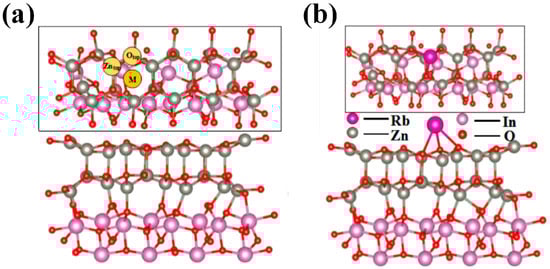 where ERb-ZnO/In2O3 represents the total energy of the Rb-ZnO/In2O3 model, EZnO/In2O3 represents the energy of the ZnO/In2O3 model, and ERb represents the energy of the Rb monomer. The more negative the Eb, the stronger the structure. According to Table 2, the binding energies were −0.094 eV for Zntop, −0.325 eV for Otop, and −0.386 eV for M. In comparison, it was found that the binding energy of the overall system was the smallest when Rb was adsorbed on the M site of ZnO/In2O3. Therefore, the Rb-ZnO/In2O3 structure at the M adsorption site was the most stable, as shown in Figure 10b.
