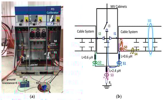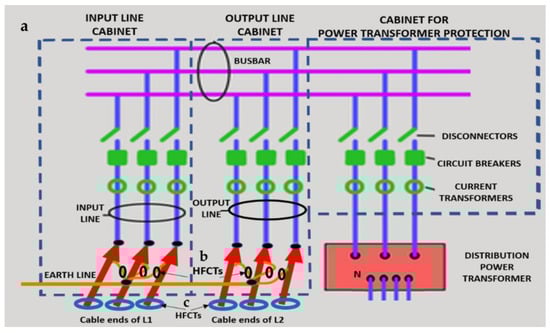 It would seem reasonable to diagnose a defect inside the MV input cabinet if the HFCT sensors placed on the grounding sheaths of the input cable (see b in Figure 1) HFCT sensors in Figure 1 only measure PD signals after closing the input switch I1, and they do not measure any PD signal when the input switch I1 is open. However, a very similar measurement would be obtained if a cavity defect were in the cable terminal connected to the MV cabinet of the input line L1; this will be justified in Section 2.2. If PD pulses generated by a cavity defect were generated on a input cable terminal L1 connected to the MV cabinet, they would not be detected by any of the HFCT sensors hugging the MV input cables until the input switch I1 was closed. This leads to the common mistake of thinking that the defect is in the MV cabinet, since PD signals are only detected when the input cabinet is energized and are not detected (PD signals apparently disappear) when it is not energized, although PD signals are continuously present in the cable terminal that is always energized. This is justified because the sensitivity of the HFCT sensors is only relevant when a current flows through the stray capacitances of the MV cabinet if the input switch is closed (see sensor S1 in Figure 2b). Additionally, it will be demonstrated in Section 2.2 that HFCT sensors that hug the cable over-sheath (main conductor and cable sheath) always have a lower sensitivity than HFCT sensors placed on the ground braid of the cable terminations.
