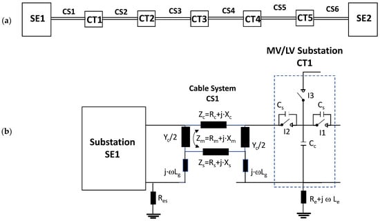 The conclusions of the single-phase test presented in Section 2.2 are extended to a real three-phase energy distribution network through an electrical equivalent model (see Figure 3). This network model emulates a set of five MV/LV substations (TC1, TC2, …, TC5) interconnected by 250 m long 12/20 kV cable systems of a 240 mm2 aluminum section (Figure 3a).