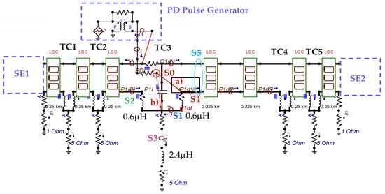 The insulation defect was generated at the MV/LV intermediate substation “TC3” by means of a simulated PD pulse generator that generates PD pulses 40 ns wide. These pulses are injected at two different sites (see Figure 4) to emulate two different insulation defects: (a) in the cable terminal or (b) into the MV cabinet.