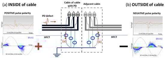 To identify the direction of propagation of the discharges, it is sufficient to place the HFCT type sensors on the terminal earth with their arrow pointing in the direction of the earth and identify the type of edge of each pulse in both half-periods. Once the polarity of the pulses in both half-periods has been identified, it is possible to determine how the PD pulses travel during the positive voltage half-period: whether the discharges travel from the cable conductor to the earth them the current pulses go down (see red down arrow a) linked to the red pulse in Figure 5a) so it is possible conclude the insulation defect is on the side of the cable system from the cable terminal, or otherwise, whether the discharges travel from the earth to the cable conductor, then the insulation defect is located on the other side of the cable terminal (see up red arrow b) linked to the red pulse in Figure 5b).
