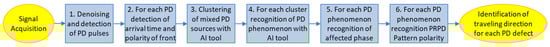 Denoising is the first challenge of a PD analyzer. Many different denoising tools have been developed for online PD measurements [19,20,21,22,23,24]. The ability to reject non-impulsive noise without losing pulse polarity is analyzed using different filtering methods. The simplest noise rejection method that does not cause the loss of pulse polarity is to reject any signal below the background noise level, but in most cases this method is not able to detect any existing PD signals, as shown in the example of Table 3 (first column). Bandpass filters can remove non-impulsive noise to detect PD pulses, but the efficiency of this approach depends on the chosen measurement frequency range, as shown in the second and third columns of Table 3. For example, for the example case shown in Table 3; selecting the 4 ± 0.5 MHz passband frequency range achieves better filtering than the 8 ± 1 MHz passband frequency range [19]. In both cases, when using a passband filter band, the PD polarity pulse is lost after filtering. A good method to remove non-impulsive noise without losing the original polarity of the pulse is to use a filter based on wavelet transform with statistical analysis [20,21,22]. This filter approach uses the entire bandwidth, while preserving the polarity of the original pulse (see the last column of Table 3).