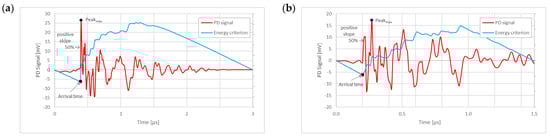 The energy curve presents a minimum value that is considered the arrival time in which the energy caused by the amplitude of the original PD pulse (first term of Formula (1)) starts to compensate the proportional average value of the pulse energy (second term of Formula (1)), as shown in Figure 7a.