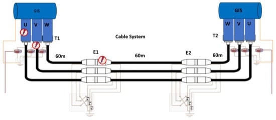 The target of the tests to be carried out is to analyze the effectiveness of a PD analyzer using HFCT sensors when there are three PD sources in different locations of the test setup. One is injected in phase U of the GIS, another in phase V of the cable terminal connected to this GIS, and the third in the junction E1 of phase W, located at 60 m from the GIS (see Figure 8). All the defects are generated with the synthetic PD pulse calibrator using a digital database of PD sources representative of insulation defects in GIS, AIS, and cable systems. PD trains are injected to ensure that the HFCT sensors receive detectable signals from the PD sources. The defects coming from the GIS can be associated with a GIS or AIS type. In this test case, PD pulses propagated from the AIS part or generated in the GIS part are simulated by type 1 to type 8 defects shown in Table 6. The defects coming from the cable only correspond to cable defects (types #15 and #16). The cable system is supposed to be long enough so that any signal coming from one substation will be completely attenuated at the other cable end. The test was repeated twice with different PD sources.