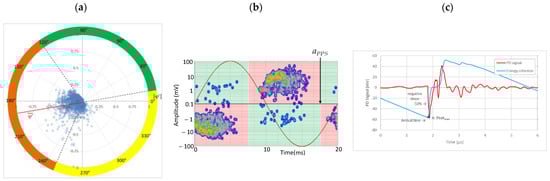 Applying the developed method to recognize the affected phase on the set of pulses clustered in VOID_P2_C, it was determined that the affected phase is C (third phase). In this case, the affected phase coincides with the phase of the sensor detecting the highest signal ratio. However, it is not always like that, due to the poor sensitivity of a certain sensor caused by measurement chain failures or by groundings of MV terminations with a bad connection. Figure 10a shows the analysis of the φ’ distribution with a circular mean value 89.9°, corresponding to the phase C section for internal void distributions. The polarity of the pattern based on the pulse polarity previously obtained (see Figure 10c) is calculated with the new developed method (see Section 3.1.5). The regions for positive pulses in the PRPD pattern are defined by the angle apps characteristic for internal void distributions (see Figure 10b). The ratio of positive pulses is Rpositives = 9.3% < 40%, which means that the pattern polarity is negative in this case. This means that the insulation defect is not in the MV cabinet P2 of the MV substation CT2 or in the rest of the grid behind it according to explanation given in Section 3 (see Figure 5).