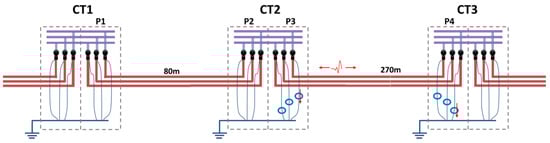 An additional measurement was required, and was performed between the MV substations CT2 and CT3, using the AI tools. Pulse polarity in this measurement was carried out in the adjacent 270 m cable system that connects both substations through the MV cabinets P3 and P4, as shown in Figure 11.