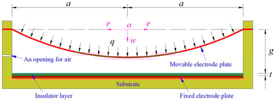 A circular capacitive pressure sensor is assumed to operate in non-touch mode after it is subjected to a static gas pressure q, as shown in Figure 1, where the dash-dotted line denotes the geometric middle plane of the initially flat movable electrode plate that has not yet been subjected to the action of the static gas pressure q, a denotes the radius of the initially flat movable electrode plate, t denotes the thickness of the insulator layer coating on the fixed electrode plate, g denotes the initial parallel gap between the initially flat movable electrode plate and the insulator layer, and the polar plane (r, φ) of the introduced cylindrical coordinate system (r, φ, w) is located in the plane in which the geometric middle plane is located, coordinate origin o is coincident with the centroid of the geometric middle plane, and the radial, circumferential, and transverse coordinates are r, φ, and w, respectively; also, w denotes the deflection (transverse displacement) of the movable electrode plate under the static gas pressure q. The movable electrode plate is generally made of a conductive membrane and the fixed electrode plate is generally made of a flat rigid conductive thin plate fixed to the substrate.