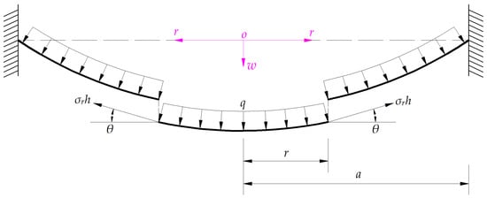 A free body of radius r (0 ≤ r ≤ a) is cut from the central portion of the deflected circular membrane in Figure 2, to study its static problem of equilibrium, as shown in Figure 3, where σr is the radial stress at r, σrh is the membrane force acting on the boundary r, and θ denotes the slope angle at r. Therefore, in the vertical direction perpendicular to the polar plane (r, φ), there is a downward force πr2q and an upward force 2πrσrhsinθ. Then, from the condition of the resultant force in the vertical direction being equal to zero, the out-of-plane equilibrium equation can be written as