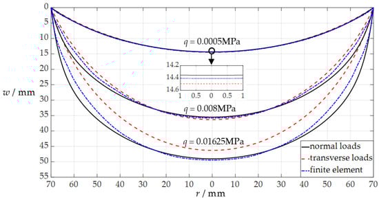 It can be seen from Figure 6 that the three analytical solutions agree quite closely for lightly loaded membranes but diverge slowly as the uniformly distributed normal load q intensifies, showing that the improvements made have achieved the expected positive effect.