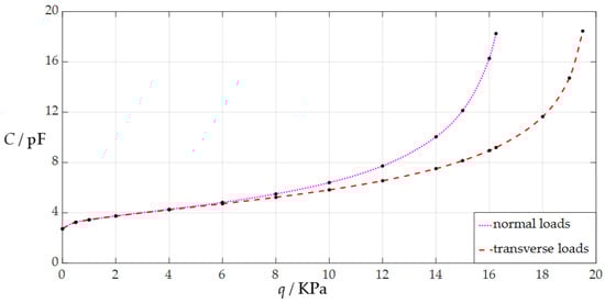 The variation in the output capacitance C with the input pressure q for the sensor with a = 70 mm, h = 0.3 mm, t = 0.1 mm, E = 3.05 MPa, ν = 0.45, and g = 50 mm, where the dotted line represents the pressure–capacitance (p–C) analytical relationship when the sensor is used for measuring normal loads and the dashed line represents the p–C analytical relationship when the sensor is used for measuring transverse loads.