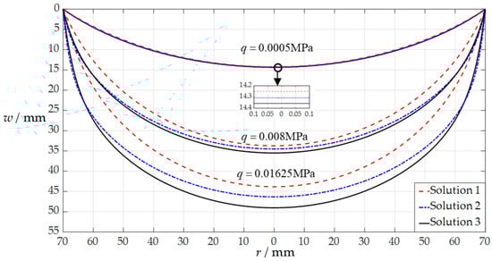 The variation of w with r when q takes the values 0.0005 MPa, 0.008 MPa, and 0.01625 MPa, where “Solution 1” refers to the result calculated using the analytical solution presented in [43], “Solution 2” refers to the result calculated using the analytical solution presented in [44], and “Solution 3” refers to the result calculated using the analytical solution presented in Section 2.2 in this paper.