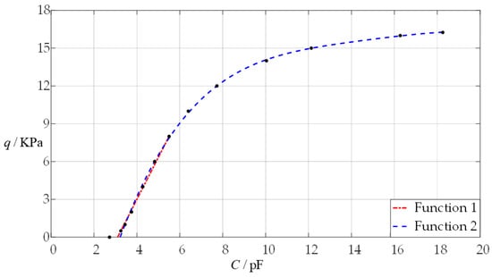 The capacitance–pressure (C–p) relationship of the sensor with a = 70 mm, h = 0.3 mm, t = 0.1 mm, E = 3.05 MPa, ν = 0.45, g = 50 mm, and its least-squares data fitting, where “Function 1” is fitted by a straight line, and “Function 2” is fitted by a quartic curve, which are listed in Table 1.