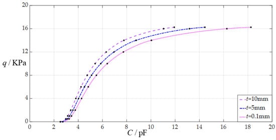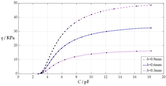 When the uniformly distributed normal load q takes different values, the numerical calculation results of the undetermined constants b0 and d0, maximum membrane deflection wm, maximum membrane stress σm, and capacitance C are listed in Table A3 for h = 0.3 mm, in Table A4 for h = 0.6 mm, and in Table A5 for h = 0.9 mm. Figure 8 shows the effect of changing the membrane thickness h on the C–q analytical relationships. As can be seen from Figure 8, the increase in the membrane thickness h does not change the range of the input capacitance C but can increase the range of the output pressure q. The degree of influence when increasing the membrane thickness h on the range increase for the output pressure q can be defined as a percentage of the two relative increments of the output pressure q and membrane thickness h. The relative increment of the membrane thickness h is equal to (0.9 mm − 0.3 mm)/0.3 mm = 200%, and from Table A3 and Table A5, the relative increment of the maximum output pressure q is equal to (48.75 KPa − 16.25 KPa)/16.25 KPa = 200%; so, the degree of influence when increasing the membrane thickness h on the range increase for the output pressure q is 200%/200% = 100%; that is, a 1% increase in the membrane thickness h can increase the maximum output pressure q by 1%.