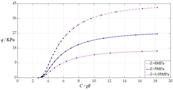 When the uniformly distributed normal load q takes different values, the numerical calculation results of the undetermined constants b0 and d0, maximum membrane deflection wm, maximum membrane stress σm, and capacitance C are listed in Table A3 for E = 3.05 MPa, in Table A6 for E = 5 MPa, and in Table A7 for E = 8 MPa. Figure 9 shows the effect of changing Young’s modulus of elasticity E on the C–q analytical relationships. As can be seen from Figure 9, the increase in Young’s modulus of elasticity E does not change the range of the input capacitance C but can increase the range of the output pressure q. The degree of influence when increasing Young’s modulus of elasticity E on the range increase for the output pressure q can be defined as a percentage of the two relative increments of the output pressure q and Young’s modulus of elasticity E. The relative increment of Young’s modulus of elasticity E is equal to (8 MPa − 3.05 MPa)/3.05 MPa = 162.30%, and from Table A3 and Table A7, the relative increment of the maximum output pressure q is equal to (42.623 KPa − 16.25 KPa)/16.25 KPa = 162.30%; so, the degree of influence when increasing the Young’s modulus of elasticity E on the range increase for the output pressure q is 162.30%/162.30% = 100%; that is, a 1% increase in the Young’s modulus of elasticity E can increase the maximum output pressure q by 1%.