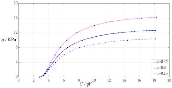 When the uniformly distributed normal load q takes different values, the numerical calculation results of the undetermined constants b0 and d0, maximum membrane deflection wm, maximum membrane stress σm, and capacitance C are listed in Table A3 for v = 0.45, in Table A8 for v = 0.3, and in Table A9 for v = 0.15. Figure 10 shows the effect of changing Poisson’s ratio v on the C–q analytical relationships. As can be seen from Figure 10, the increase in the Poisson’s ratio v does not change the range of the input capacitance C but can increase the range of the output pressure q. The degree of influence when increasing the Poisson’s ratio v on the range increase for the output pressure q can be defined as a percentage of the two relative increments of the output pressure q and Poisson’s ratio v. The relative increment of the Poisson’s ratio v is equal to (0.45 − 0.15)/0.15 = 200%, and from Table A3 and Table A9, the relative increment of the maximum output pressure q is equal to (16.25 KPa − 10.353 KPa)/10.353 KPa = 56.96%; so, the degree of influence when increasing the Poisson’s ratio v on the range increase for the output pressure q is 56.96%/200% = 28.48%; that is, a 1% increase in the Poisson’s ratio v can increase the maximum output pressure q by 0.2848%.