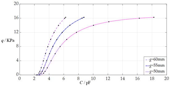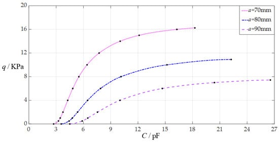 After the above numerical design of the sensor hardware is completed, the numerical calibration of the sensor can be achieved as follows. Since the mechanism of using a circular non-touch mode capacitive pressure sensor to measure the static gas pressure q (as shown in Figure 1) is to detect the static gas pressure q by measuring the capacitance C of the sensor to which the static gas pressure q is applied, then such a static gas pressure measurement system requires an analytical relationship of the input capacitance as an independent variable and the output pressure as a dependent variable (the capacitance–pressure (C–p) analytical relationship), rather than the analytical relationship of the input pressure as an independent variable and the output capacitance as a dependent variable (the pressure–capacitance (p–C) analytical relationship) shown in Equation (4).