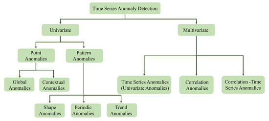 Time series anomaly detection can be divided into univariate and multi-variate based on the detection target as shown in Figure 1. The anomaly types of univariate time series can be divided into two major categories, namely, point anomaly and pattern anomaly. A series of continuous points causes pattern anomalies, which can be further divided into periodic anomalies, shape anomalies, and trend anomalies. The anomaly types of multi-variate time series can be divided into three categories. In addition to including the most common anomaly types of univariate (time series anomaly), there are two unique anomaly types, which are the correlation anomaly and correlation–time anomaly. The correlation anomaly indicates that the relationship between multiple indicators has undergone a sudden change or violated the historical relationship. This type of anomaly is usually caused by a sudden event of one or more variables, causing the relationship between this variable and other variables to change. The correlation–time anomaly includes both the correlation anomaly and time anomaly, and it is the most accessible type of anomaly to detect.