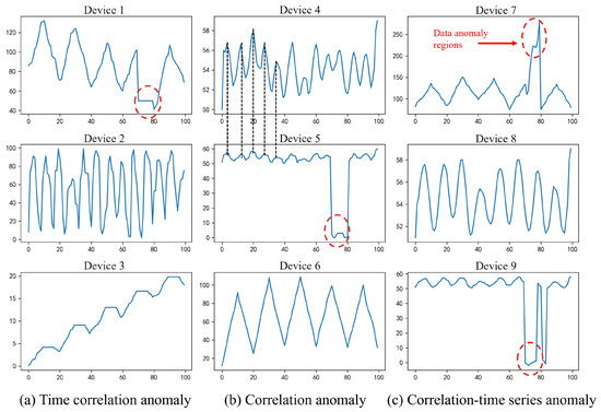 Figure 2a shows the most common type of time series correlation anomaly. Sensors 2 and 3 are normal during the detection time. However, the data of device 1 in the red area have undergone a sudden change compared to their own data’s linear pattern of rising and falling over some time, becoming a horizontal line. This significant deviation from its corresponding historical normal pattern violates the time correlation. Figure 2b shows the type of correlation anomaly. By observing the data of sensors 4 and 5, it can be found that the historical pattern shows a positive correlation in the non-red area. Still, device 5 violates this pattern in the red area, violating the correlation. The detection of this type of anomaly requires a clear understanding of the relationships between multi-dimensional data, which poses a significant challenge to algorithm research. Figure 2c shows the correlation–time kind of anomaly. It can be seen that for sensors 7 and 9, the historical data show a regular rise and fall pattern. Still, in the red area, the value shows violent fluctuations, indicating that sensors 7 and 9 violate the time correlation. Secondly, by observing sensors 8 and 9, it can be seen that there is a clear positive correlation in the non-red area. Still, sensor 9 maintains a horizontal line value without change in the red area, indicating that sensor 9 also has a fault. That is to say, in the type of correlation–time anomaly, both time dependency and relationship dependency are violated, so this type is most often easier to detect. Whether severe or subtle, each type of anomaly may indicate potential problems in the system. Therefore, the goal of the multi-variate anomaly detection system should be to detect as many of the three anomalies as possible. For this, the model design should be able to simultaneously capture the time features within the sensor at the same moment, as well as the relationship features between the sensor and other sensors.