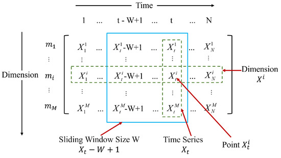 Figure 3 represents a set of multi-variable time series (MTS) data. The dataset, denoted as , , contains continuous observations with equal interval sampling, where M and N are the number of dimensions and the length of the data, respectively. In each row, represents a dimension, and in each column, is an observation. Taking the data from a Web application server as an example, dimensions include CPU utilization, memory utilization, the number of TCP connections actively opened, the number of packets transmitted per second, etc. The entire entity (i.e., the multi-variate time series data) characterizes the state of the server. Multi-variate time series data typically have time correlation within each dimension (for example, the periodicity of CPU utilization), as well as the correlation between different dimensions (for example, the positive correlation between the number of packets transmitted per second, the number of TCP connections actively opened, and CPU utilization). To fully incorporate contextual information, we apply a sliding window of length W on the MTS to calculate the anomaly results. This transforms the MTS into a set of windowed samples, which are then used as inputs to the model. Under normal circumstances, these sensor values may fluctuate within a certain range. However, if at a specific time point, the value of a particular sensor significantly deviates from the expected range—for example, a sudden increase in temperature or an unexpected pressure drop—then that data point could be considered an anomaly. Anomaly detection aims to determine whether the observed result is abnormal. Anomaly interpretation is achieved through localization, that is, finding a set of dimension values (, ) that are the most anomalous for each detected entity anomaly .