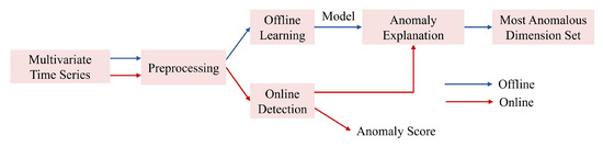 Our method as shown in Figure 4 consists of two parts: offline training and online detection. Data preprocessing is a module shared by these two parts. During data preprocessing, the dataset is standardized and then divided into multiple subsequences by a sliding window. The preprocessed multi-variate time series data are sent to the model training module for training in order to establish a model that can capture the normal patterns in the multi-variate time series. The online detection module stores the trained model. Then, the preprocessed new data window (for example, at time t) is sent to the online detection module to obtain its anomaly score. If the anomaly score of is higher than the anomaly threshold, will be classified as an anomaly; otherwise, it is considered normal. If is detected as an anomaly, it is interpreted by estimating and ranking the contribution (i.e., reconstruction probability) of each dimension.