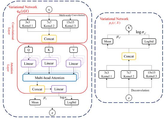 The basic theory of VAE [23] is as follows: suppose is the input data, and is the latent variable. VAE aims to learn a conditional distribution so that a given can be sampled from the latent space and generate new samples similar to . To achieve this goal, VAE first maps the input data to the latent space , obtaining the encoder . Then, samples a latent variable from it and decodes it into data similar to , obtaining the decoder . To ensure that the data generated by the decoder are similar to the input data , VAE introduces a reconstruction error term, representing the difference between and . At the same time, to give the learned latent space a specific structure and continuity, VAE also introduces a regularization term, the prior distribution of the latent variable .