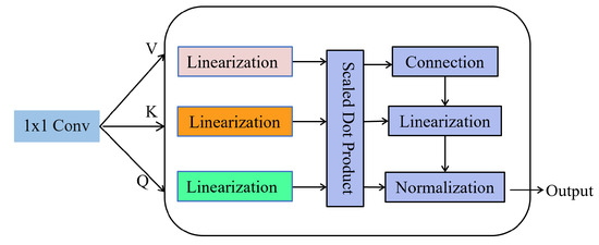 Using the multi-head attention mechanism to extract the correlation between dimensions, we first initialize the matrices , , and from the global feature vector matrix T obtained in the previous convolutional network. These three matrices serve as key parameters for the single-head attention mechanism. The main idea of the single-head attention mechanism is the Scaled Dot-product Attention (SDA), which first calculates the similarity by solving the dot product of and and then divides by ( is the dimension of matrix ) to prevent the dot product calculation result from being too large. Then, it normalizes the result through the Softmax function and multiplies it by the matrix to obtain the attention expression. The calculation method of SDA is shown in Equation (6):