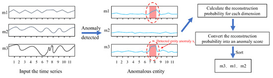- For the detected entity anomaly , calculate the reconstruction probability of each dimension , where is the parameter of VAE, and is the latent vector within the time window from to t.