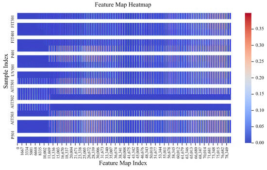 In the feature heatmap, the horizontal axis represents the feature values, and the vertical axis represents the device number. Flattening all feature maps, each 1667 activation value is taken as a group and displayed as a square in the heatmap. The color represents the size of the activation value. The brighter the area, the larger the group of activation values, so the importance of this feature at this location is higher. In the feature heatmap, many features have high activation values in a specific interval, indicating that this feature is very important for distinguishing samples. Observing the feature heatmap, you can see that the color of UV501 is the brightest, and the color of AIT502 is lighter. Combined with the dataset, it can be found that UV501 is the core sensor; its value will greatly affect the operation of the entire system, the data change amplitude and frequency of the UV501 dimension are huge, and more time series features can be obtained. The role of AIT502 is relatively small, the data change smoothly, with fewer time series features, and the performance of the feature map is consistent with the dataset analysis. Therefore, our multi-scale, multi-channel convolution kernel can effectively extract time series features within the dimension from the dataset.