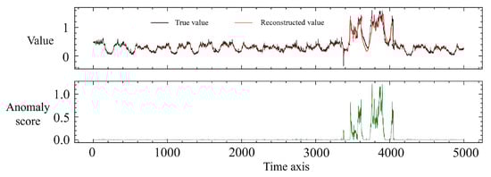 where represents the reconstruction error variance on the i-th dimension, which the reconstruction error on the i-th dimension in the training set can estimate. Normal time series samples can be successfully reconstructed, so their reconstruction probability should be relatively high. They cannot be successfully reconstructed for abnormal time series samples, so their reconstruction probability should be relatively low. To make the anomaly score intuitively display the anomaly situation, the reconstruction probability is transformed using a negative logarithm as shown in the Equation (13):