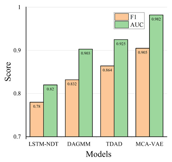 Next, to more comprehensively evaluate the performance of our model and similar research results, we conduct five repeated experiments for each method, select the highest score among them, and draw a model performance comparison chart as shown in Figure 14. As can be seen from the F1 and AUC overall indicators, MCA-VAE is superior to all baselines, and compared with the second-best algorithm TDAD, our model’s F1 has increased by 4%. Our model proposes an improved multi-scale weight-sharing convolutional network to extract temporal features, a multi-head attention mechanism to extract inter-dimensional features, and an enhanced variational autoencoder that can extract more features, improving the accuracy of subsequent anomaly detection tasks. Other methods mainly model one type of dependency in MTS. For example, LSTM-NDT models time dependency, while DAGMM, and TDAD focus on inter-dimensional correlation. Among them, LSTM-NDT shows the lowest performance, the reason being that it only models temporal features. The inter-dimensional feature relationships between SWaT data are close, so DAGMM and TDAD achieve good results. Among them, the effect of TDAD is second best because it uses an attention mechanism to extract inter-dimensional features further, improving the detection effect.