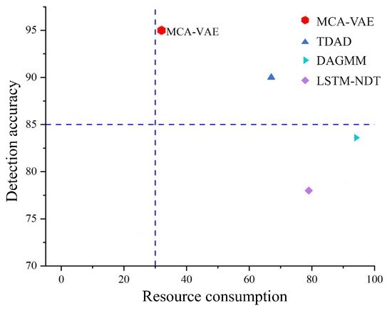 We take the weighted values of memory consumption and time consumption as the x-axis and the weighted values of the F1 score and AUC score multiplied by 100 as the y-axis to draw a comprehensive performance and resource consumption figure as shown in Figure 15. We define the boundary for resource consumption as a weighted value of 30 for memory and time consumption; models with values greater than 30 are considered complex models, while those with values less than 30 are deemed lightweight models. The performance indicator 85 is used as the boundary; models with values greater than 85 are high-precision models, and those with values less than 85 are general precision models. MCA-VAE leads other baseline models in detection accuracy and is close to lightweight models regarding resource consumption. The experimental results prove that our algorithm significantly improves performance and resource consumption compared to similar algorithms.