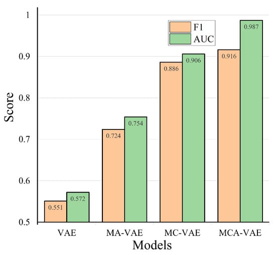 We conduct comparative experiments on different model components to demonstrate the necessity of each module in our algorithm. We separately use the standalone VAE model, the MC-VAE model, which uses a multi-scale weight-sharing convolutional neural network; the MA-VAE model, which uses an attention mechanism and a variational autoencoder, and MCA-VAE for ablation experiments. The experiments are conducted thrice, and the best results are selected as shown in Figure 17.