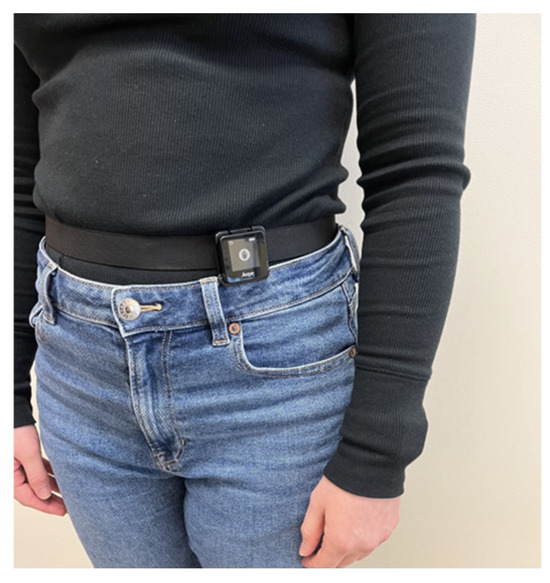 An ActiGraph™ GT9X (ActiGraph, Pensacola, FL) was used in this work, a tri-axial accelerometer with the following coordinate system: y-axis = vertical direction, x-axis = horizontal direction, and z-axis = perpendicular direction when oriented as displayed in Figure 2. Participants were instructed to wear an ActiGraph™ GT9X for up to seven days on their non-dominant hip attached by a belt, as shown in Figure 3, except while sleeping or showering. Seven days was selected for this study as it is the most common duration utilized for assessing physical activity in cLBP based on a scoping review [20].