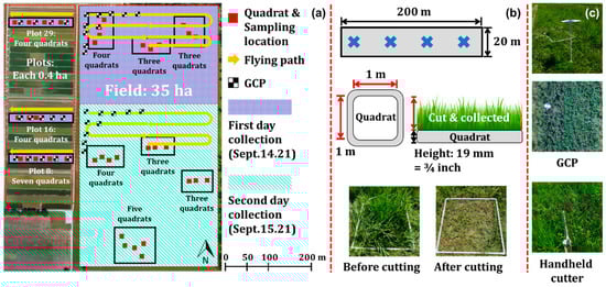 Experimental information on plots and field: (a) quadrat (sampling) locations, GCP locations, and flight path; (b) plot and quadrat dimensions, and inside of the quadrats before and after sampling; and (c) GCP on the field and handheld cutter images.