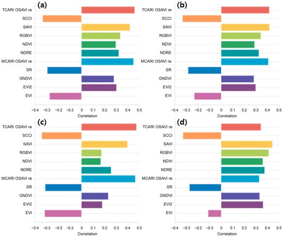 Pearson correlation coefficients between VIs and dry mass: (a) Mean, (b) Median, (c) Quantile 90%, and (d) Quantile 10%.