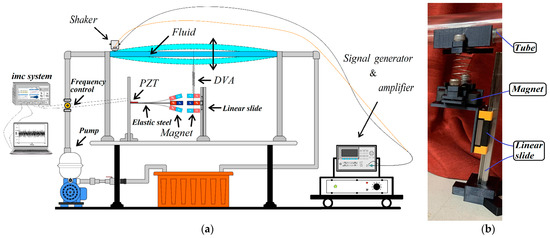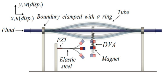 This research is structured into three parts: a theoretical model derivation, a theoretical and numerical analysis, and a simple experimental verification. (1) Theoretical Model Derivation: Utilizing Hamilton’s Principle, the equation for the nonlinear fluid–solid coupling elastic fixed-free beam with an additional DVA will be derived to simulate the motion of the fluid pipeline. The Biot–Savart Law will be employed to derive the repulsive force arising from the interaction between the magnets on the flow tube’s DVA and those on its neighboring elastic fixed-free beam. This damped pipe flow system will incorporate an elastic beam equipped with a piezoelectric patch (PZT), resulting in the creation of a comprehensive “flow tube vibration reduction and magnetic dipole–dipole interactions vibration energy harvesting system”. (2) Analytical and Numerical Analysis: The method of multiple scales (MOMS) will be employed to categorize the time domain into two scales: fast and slow. The separation of the variables will be applied to segregate the variables into the time and space domains. The boundary conditions will be used to determine the mode shape of the fixed-free beam. A fixed-points plot will be employed to analyze the frequency response and amplitude of the flow tube. The fourth-order Runge–Kutta method (RK-4) will be used to solve the equations governing the vibration of the flow tube and magneto-electric bistability, taking into account the mutual repulsion of magnets. This analysis will predict the vibration reduction effect of the vibration absorber and calculate the maximum efficiency of the electric energy conversion in the proposed system. (3) Verification of the Experiment: A simple experimental setup will be constructed, as depicted in the conceptual design schematic diagram in Figure 2. Fluid will be injected into the pipeline system using a water pump to simulate fluid flow, inducing vibration in the pipeline. The incorporation of a DVA aims to reduce the vibration in fluid pipelines. By leveraging the repulsive characteristics of magnets, the entire system will adopt a magnetic dipole–dipole interactions configuration, resulting in the vibration of the cantilever beam. The MDDI VEH system, created by this magnetic dipole–dipole interactions energy well configuration, will transfer the vibration energy from the DVA to the fixed-free cantilever beam, thereby enhancing the displacement and deformation. The installation of a piezoelectric patch at the root of the cantilever beam aims to maximize the deformation, thereby increasing the electric generation efficiency.