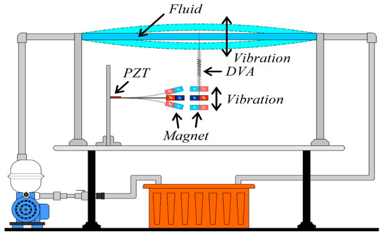 Conceptual experimental design of the fluid-structure coupled vibration damping and magneto-electric MDDI VEH system.