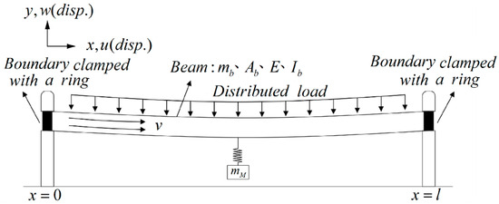 The first integral term represents the kinetic energy of the beam, the second integral term signifies the kinetic energy of the fluid, and the third integral term denotes the kinetic energy of the vibration absorber. ( )’ represents , and represents . Here, mb represents the mass of the beam, mf is the mass of the fluid, and mM is the mass of the vibration absorber. Additionally, wM represents the displacement of the vibration absorber, denotes the displacement on the beam position of lM, and lM represents the position where the vibration absorber is installed on the beam. The variables u and w symbolize the displacement of the elastic beam in the x and y directions, respectively. is the velocity term, and represents the relative velocity between the fluid and the beam, where the flow velocity v is a function of time. Then the potential energy of the system can be expressed as